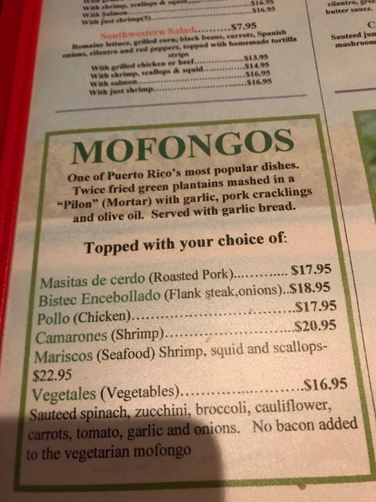 Sauteed spinach, zucchini, squash, broccoli, cauliflower, carrot, tomato, garlic and onions. No bacon added to the vegetarian mofongo